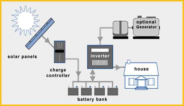 4) Off-grid inverter: There`s no requirement for an inverter if you`re only setting up solar panels for your devices that run on DC current. You will need an inverter to convert DC to AC for AC electrical appliances. Electric current flows from the solar panels through the charge controller into the bank battery bank before it is finally converted into AC by the off-grid inverter.